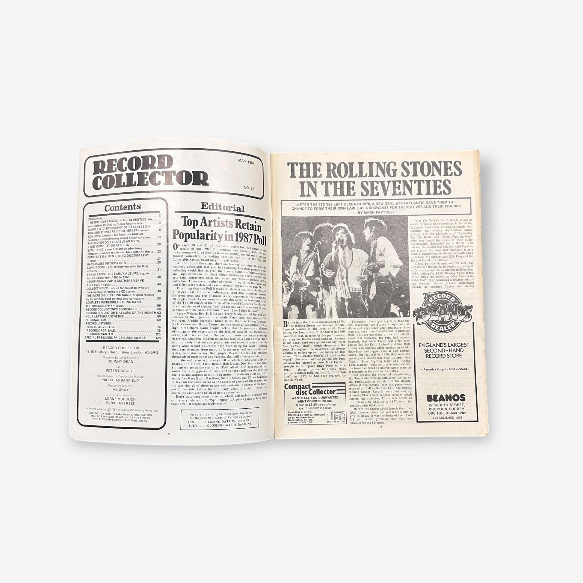 Original May 1987 (No. 93) Record Collector Magazine featuring The Rolling Stones on the cover story.