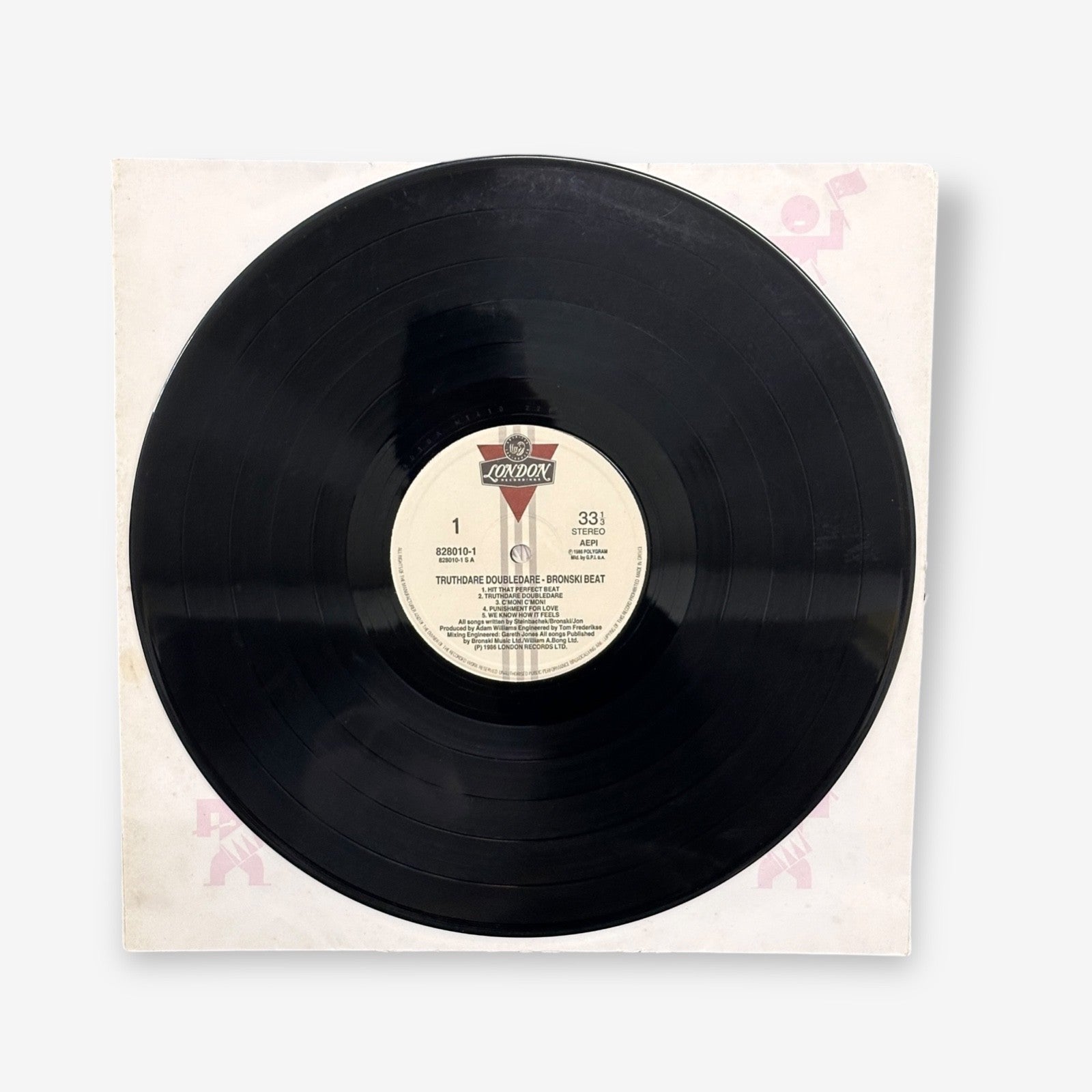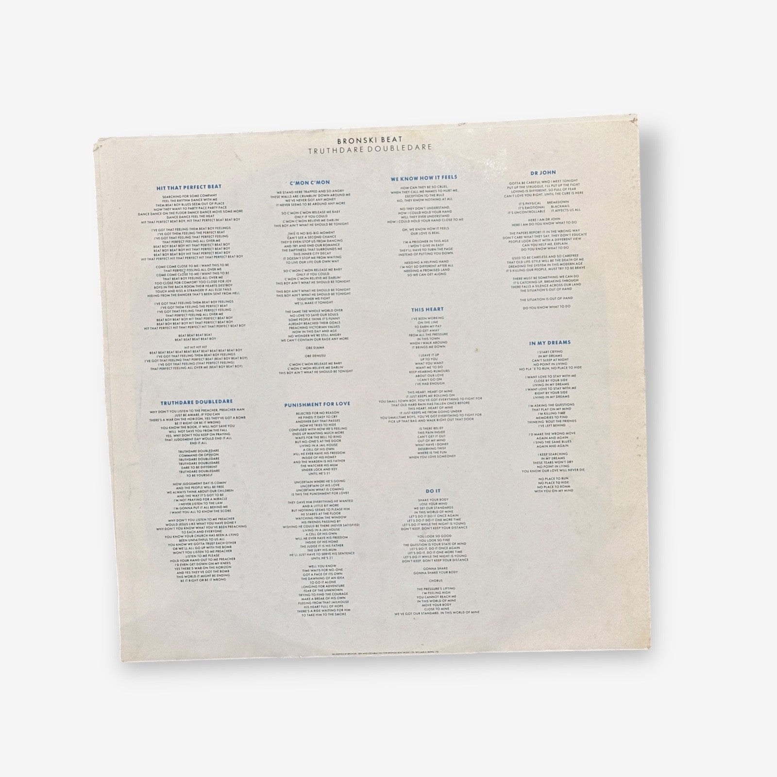 Original Bronski Beat - Truthdare Doubledare vinyl record from 1986 featuring hit songs such as "Truthdare Doubledare" and "C'mon! c'mon!". Contains one double sided record.