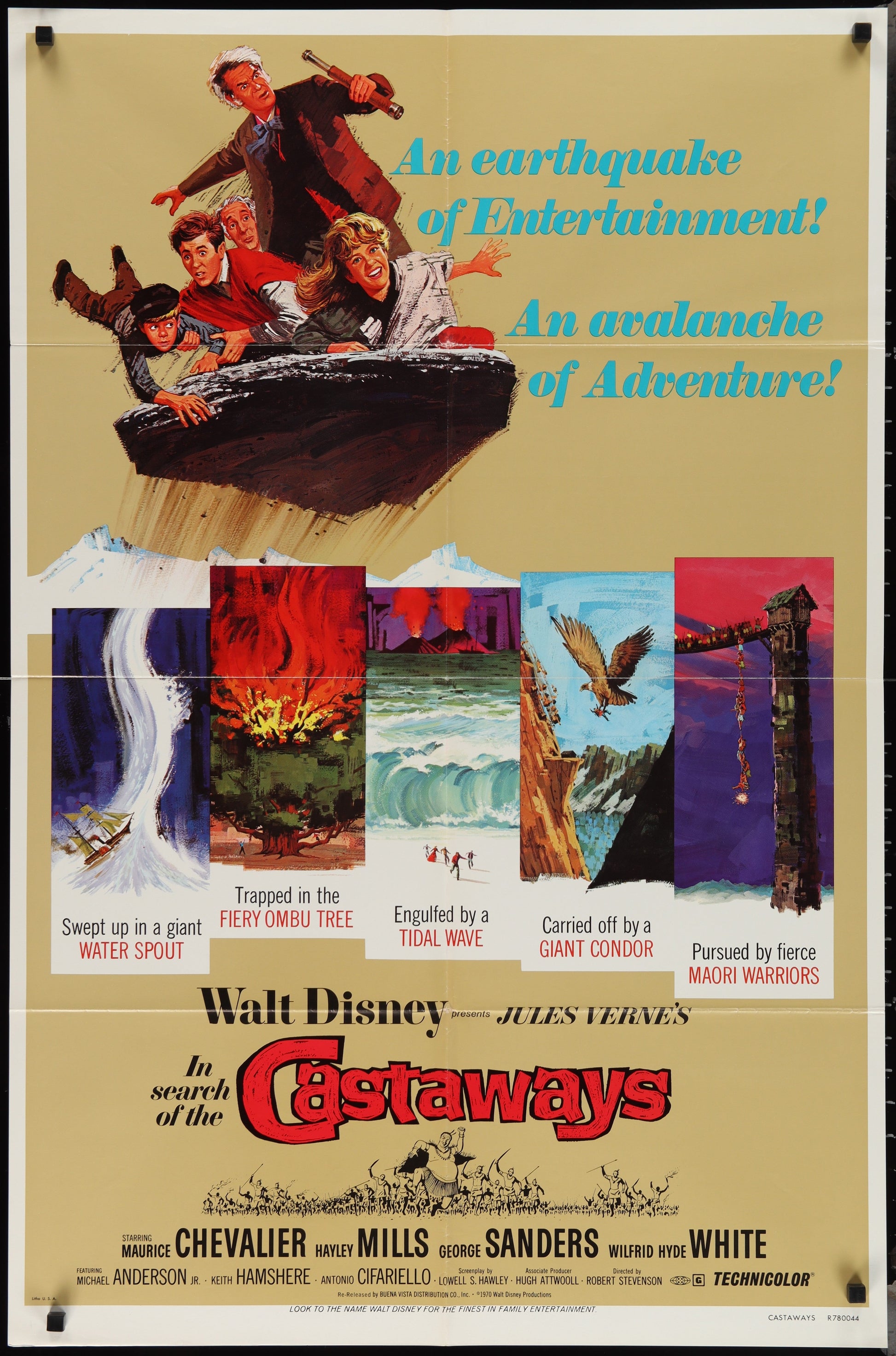 This 1978 re-release one-sheet movie poster measures 27" x 41" (69 x 104 cm). It was produced for the 1962 Robert Stevenson Walt Disney fantasy adventure Castaways, starring Maurice Chevalier, Hayley Mills and George Sanders. There are small areas of separation at fold meet points, with wear on the edges and folds.