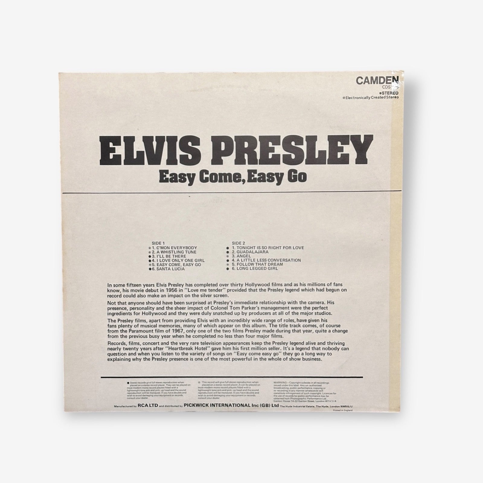 Original Elvis Presley - Easy Come, Easy Go vinyl record from 1975 featuring songs from the album Easy Come, Easy Go with songs such as "A little less conversation" and "Easy Come, Easy Go". Contains one double sided record.