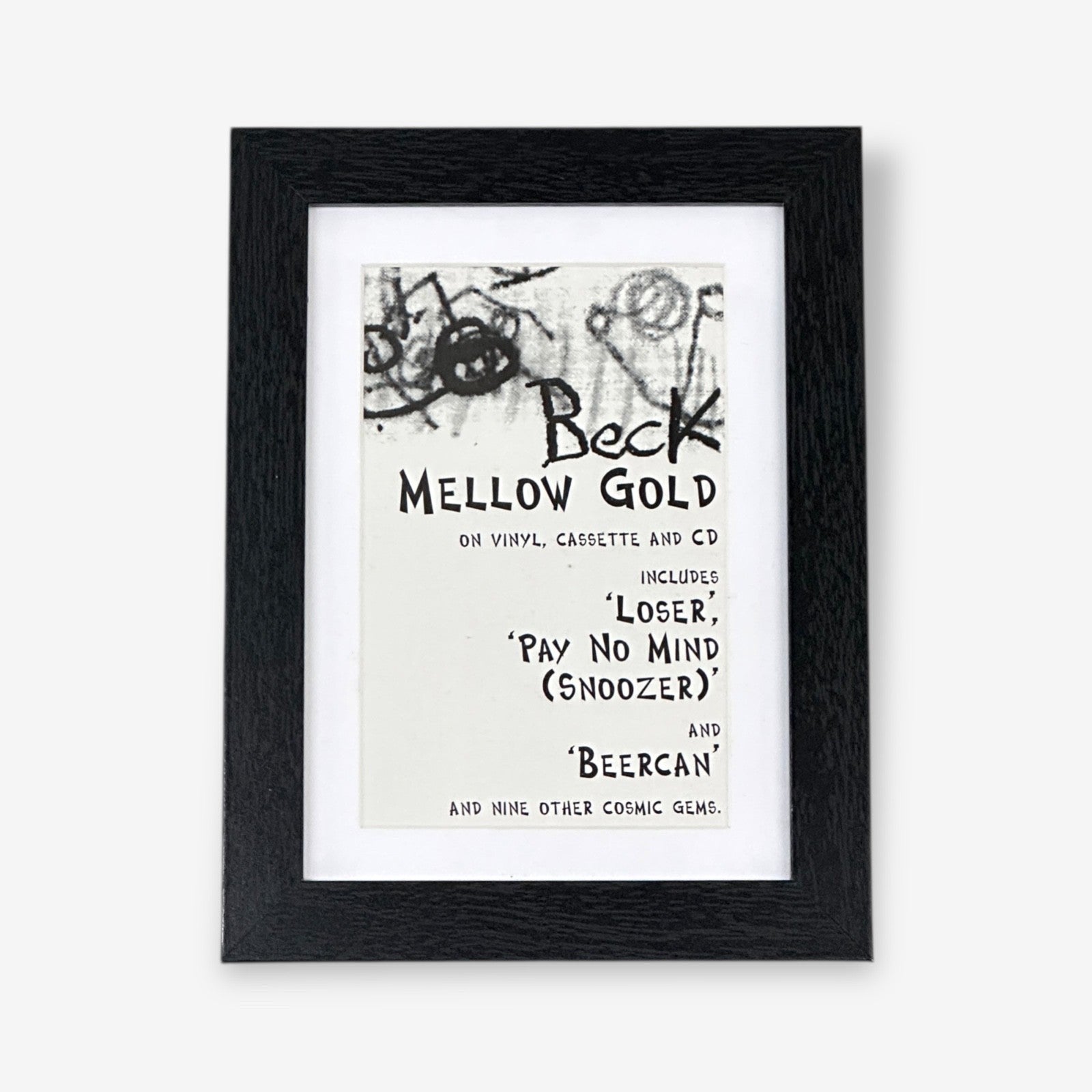 Framed and mounted Beck 'Mellow Gold Album' clipping from Vox magazine year 1995. Frame also has a back stand to sit on a surface.