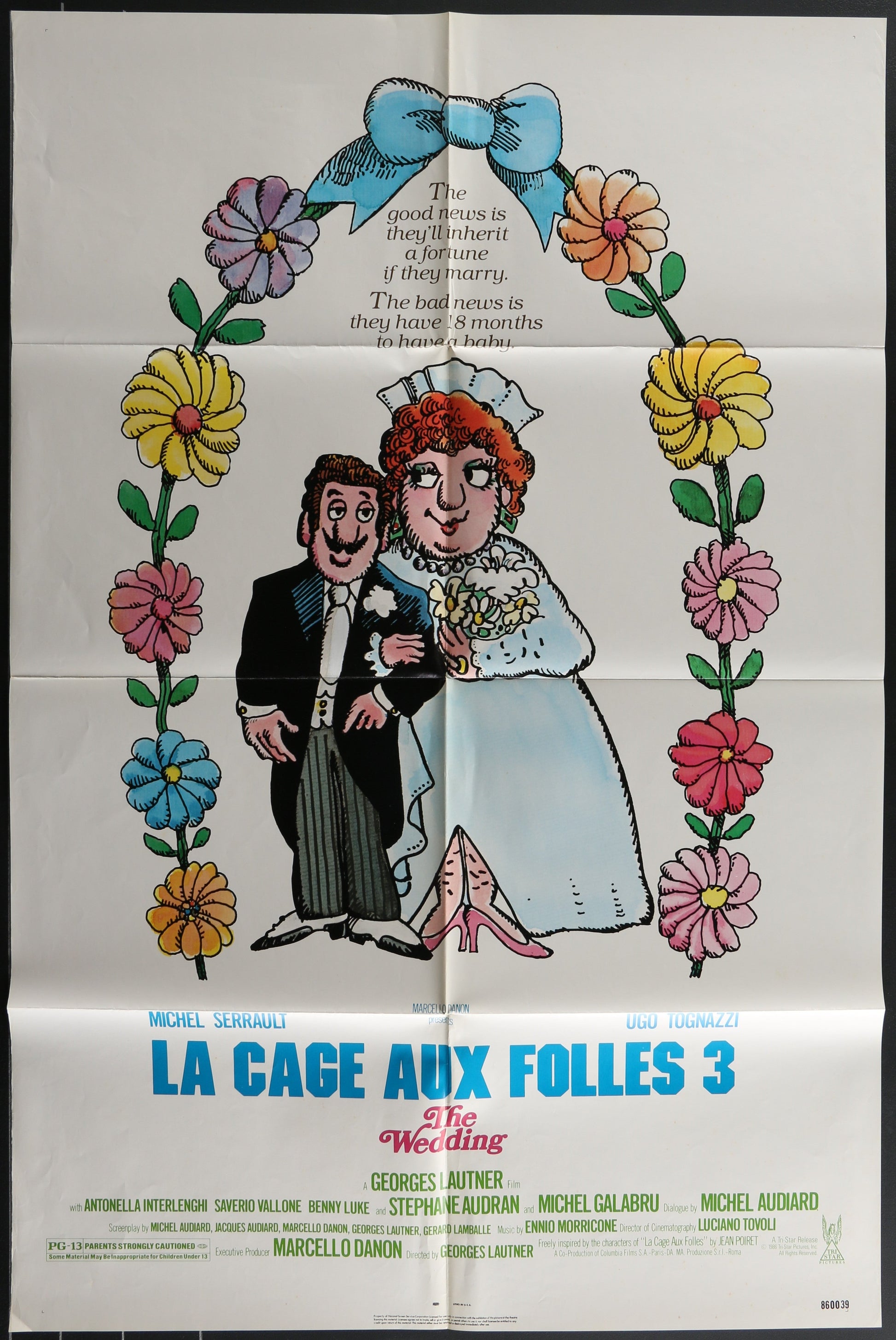 This 1986 Folded One-Sheet Movie Poster (27" x 41" [69 x 104 cm]) is from the movie La Cage Aux Folles 3: The Wedding, a 1985 Georges Lautner comedy sequel featuring Michel Serrault and Ugo Tognazzi. Minimal edge and fold wear is present, along with small markings across the bottom section of the poster.