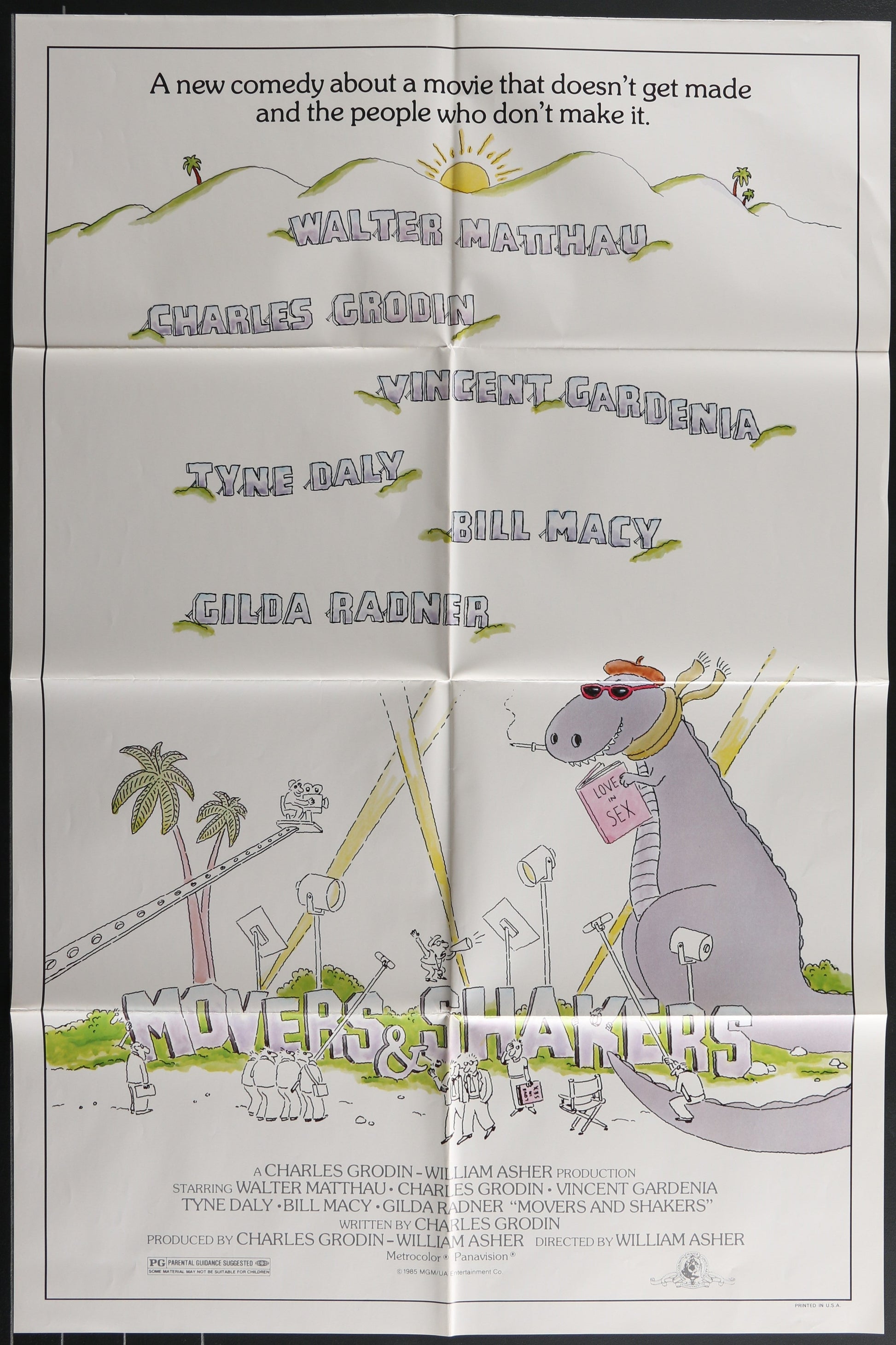 Mild edge and fold wear is present on the 27" x 41" (69 cm x 104 cm) Original Folded One-Sheet Movie Poster of William Asher's 1985 comedy Movers and Shakers, starring Walter Matthau, Charles Grodin, Vincent Gardenia, Tyne Daly, Bill Macy, and Gilda Radner.