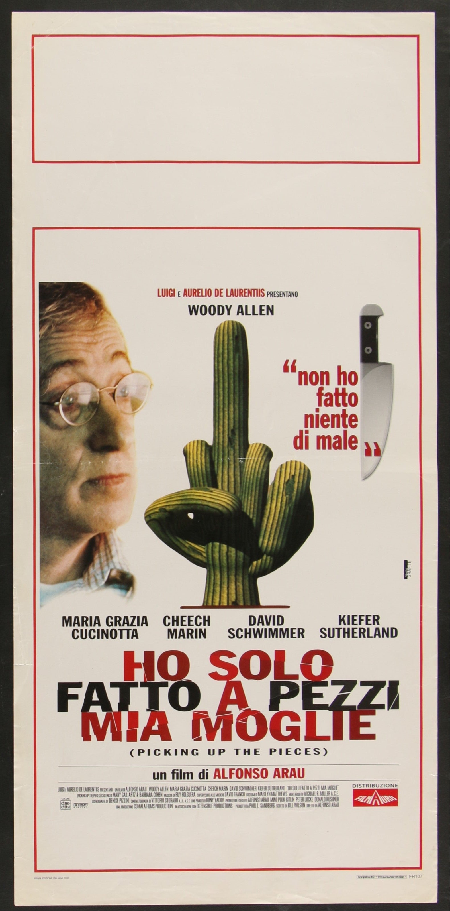 This Picking Up The Pieces (2000) Original Italian Locandina Movie Poster measures 13 1/4" x 27 1/2" [34 x 70 cm] and features the 2000 Alfonso Arau comedy starring Woody Allen, David Schwimmer, and Sharon Stone. It has a small tear on the left border and some creasing.