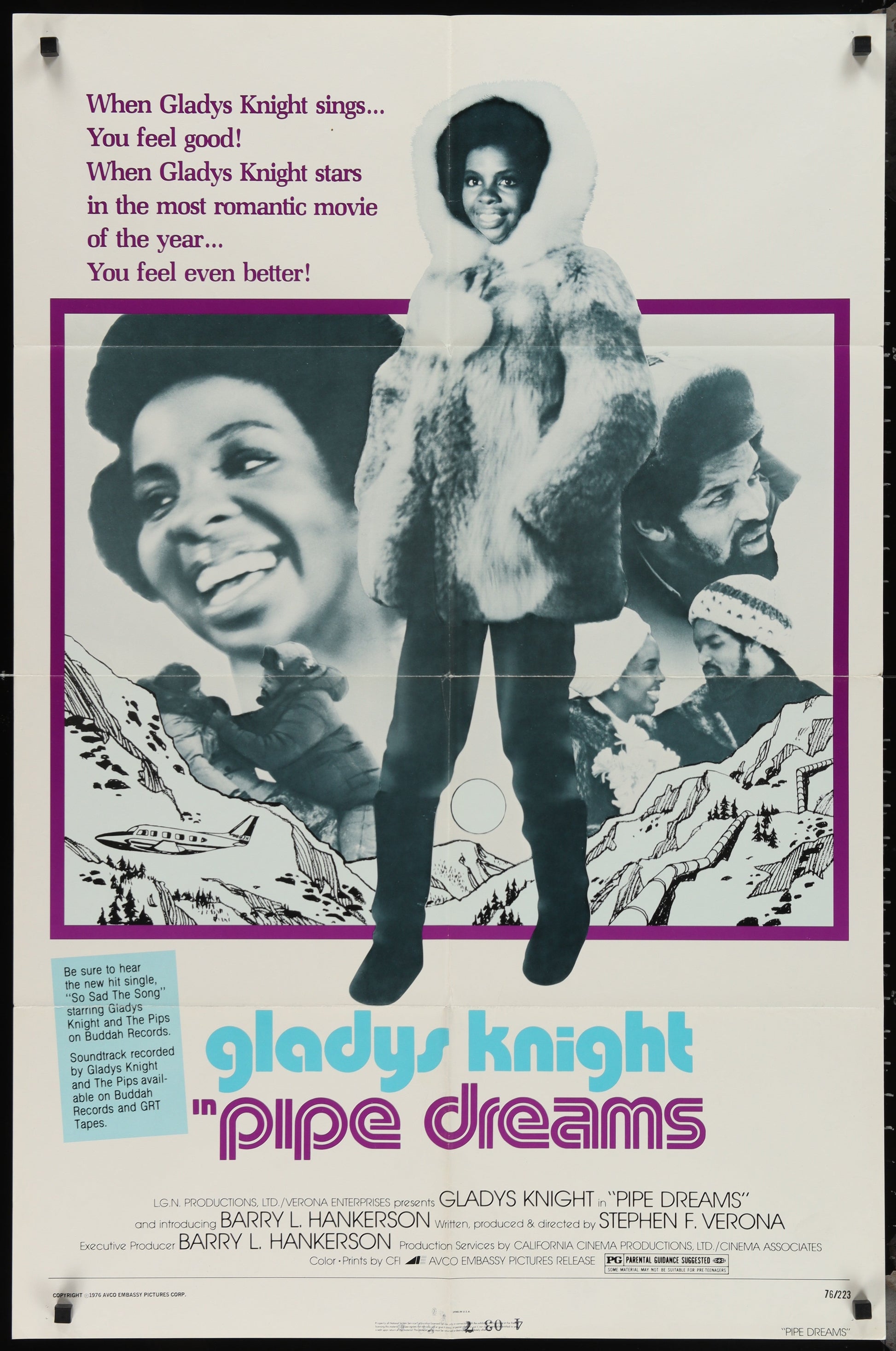 This Original Folded One-Sheet Movie Poster (measuring 27" x 41" [69 x 104 cm]) for the 1976 Stephen F. Verona musical comedy Pipe Dreams, featuring Gladys Knight, Barry L. Hankerson, and John Mitchum, displays minor edge and fold wear along with an ink stamp at the bottom center.