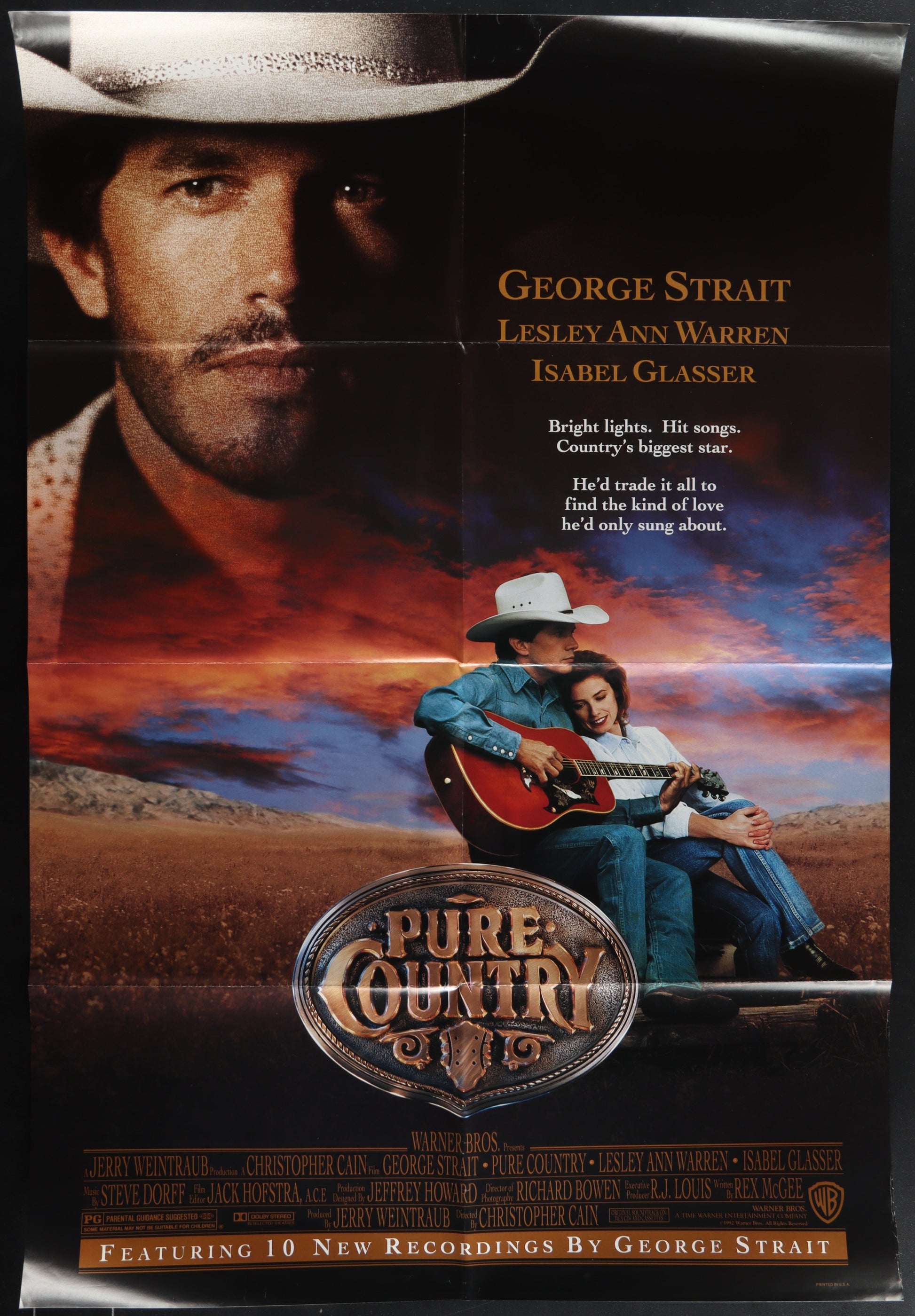 This is an original folded one-sheet movie poster measuring 27" x 41" (69 x 104 cm) for Pure Country, the 1992 country music drama directed by Christopher Cain and starring George Strait and Lesley Ann Warren. The poster shows edge and fold wear, along with some creasing near the border.