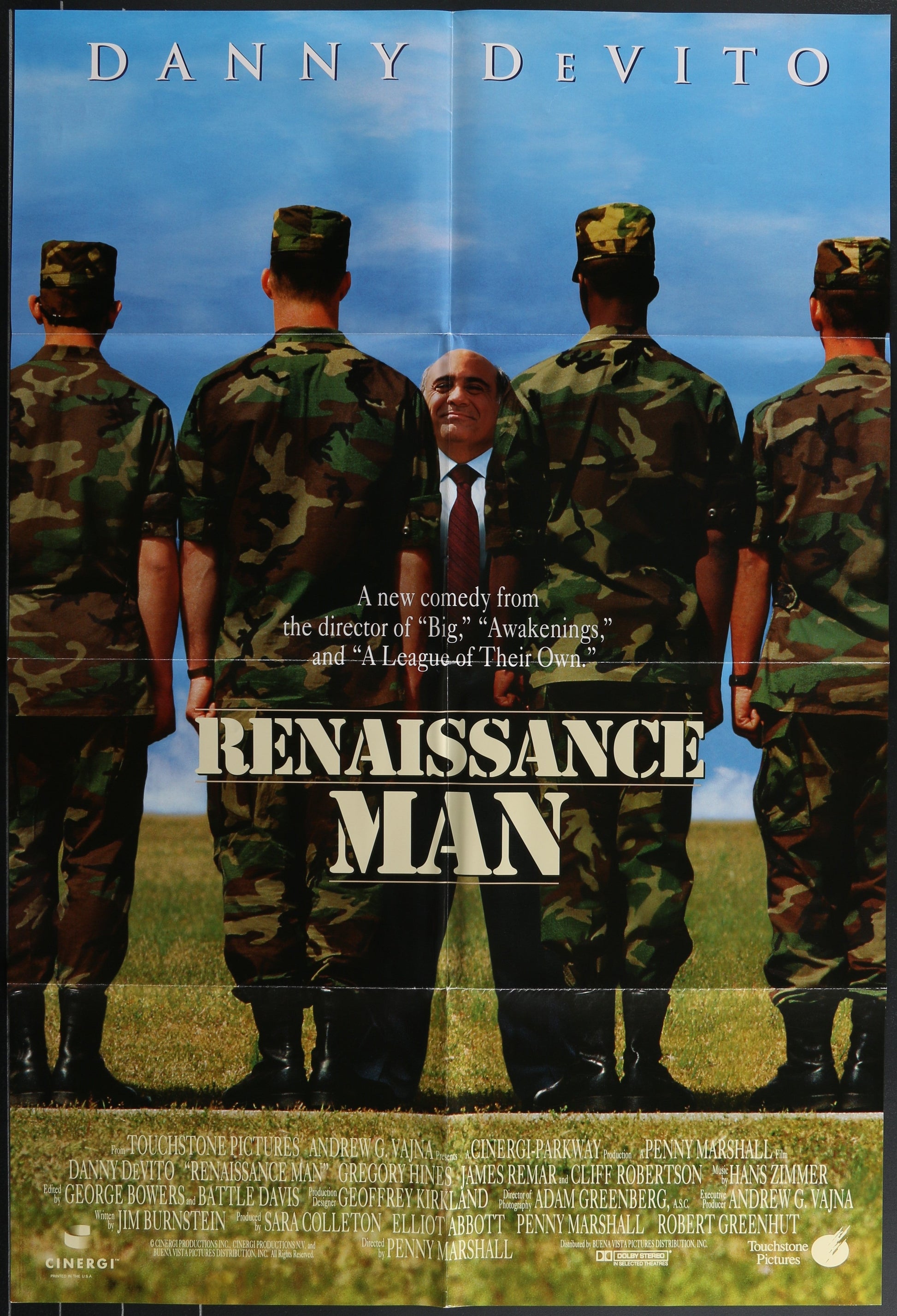 Double-Sided Folded One-Sheet Renaissance Man Movie Poster (27" x 40"). Released in 1994, the Penny Marshall directed comedy featured Danny DeVito, Gregory Hines and James Remar. Fold and edge wear.