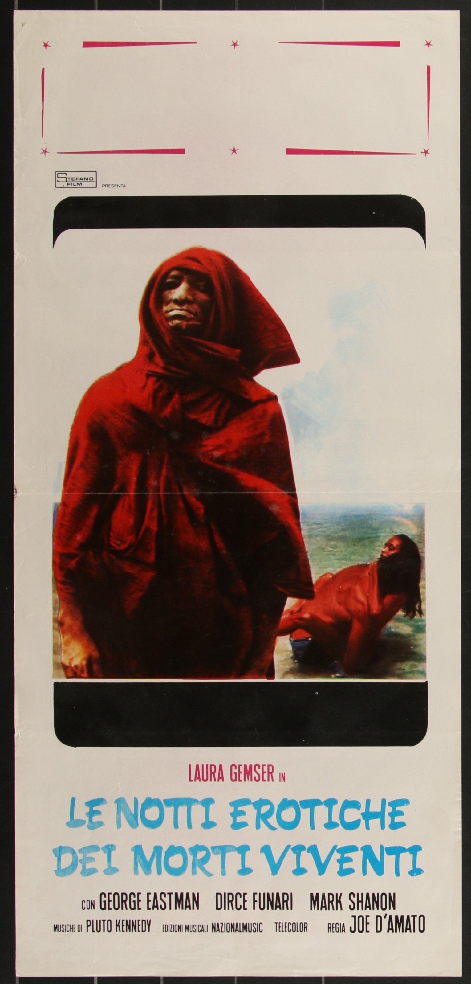 This is an original folded Italian Locandina movie poster measuring 12 3/4" x 27 1/2" (32 x 70 cm) for the 1980 sexploitation horror film Sexy Nights of the Living Dead, directed by Joe D'Amato and starring Laura Gemser and George Eastman. The poster shows edge and fold wear along with some markings.