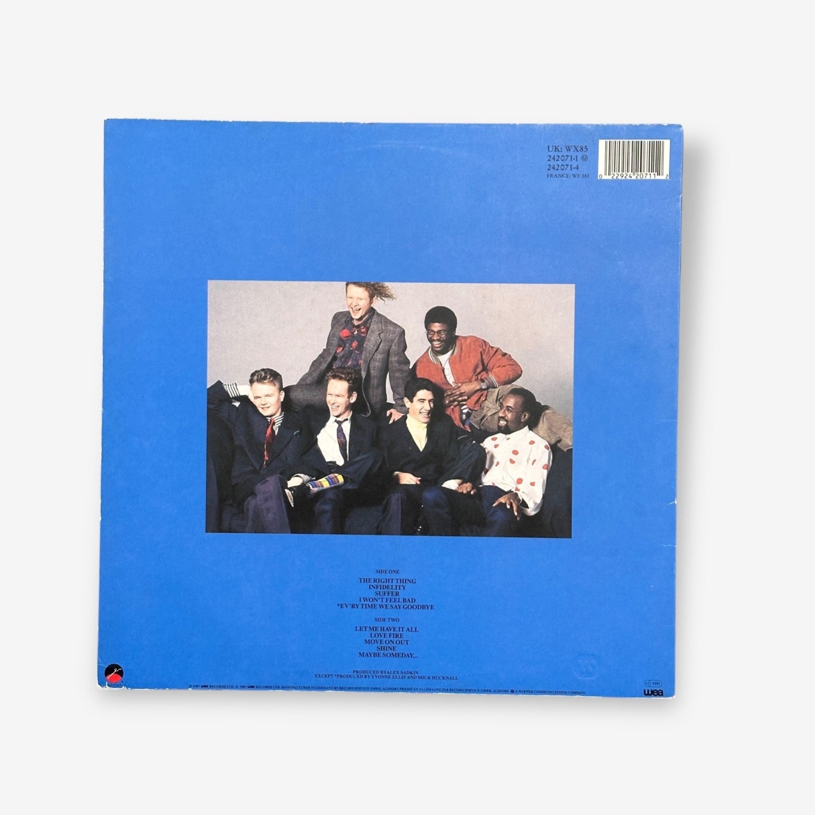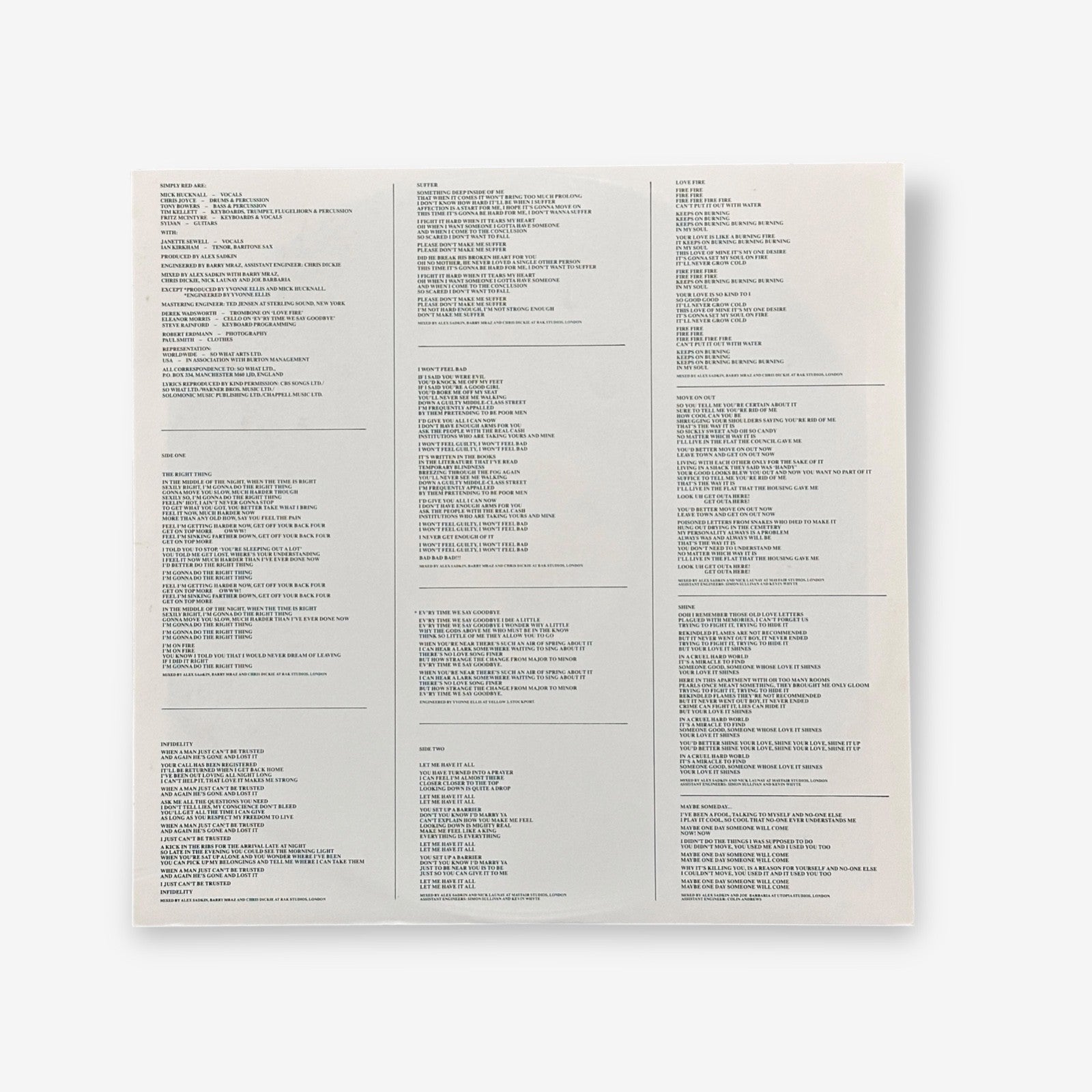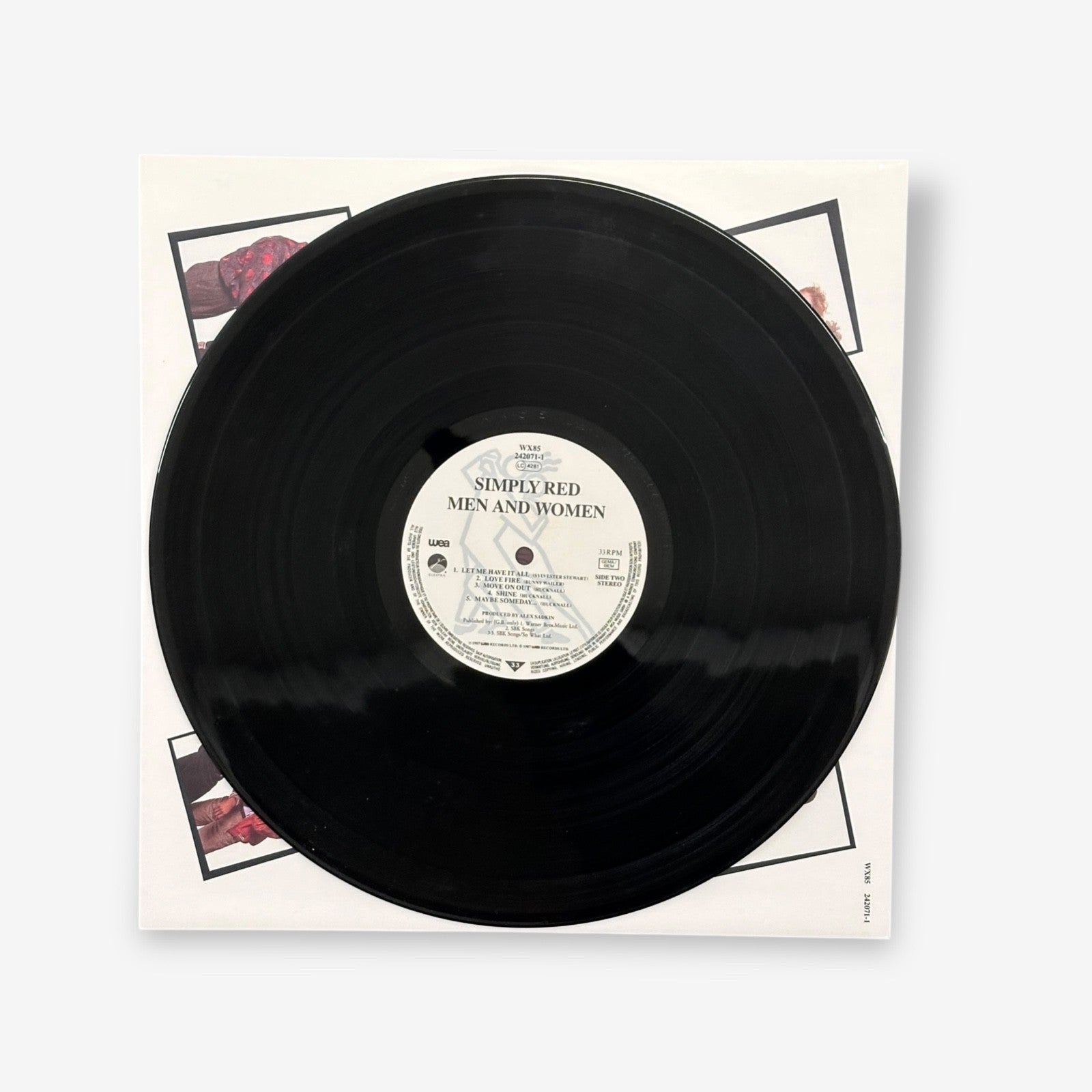 Simply Red - Men And Women vinyl record from 1987 featuring hit songs such as "The Right Thing" and "Infidelity". Contains one double sided record.