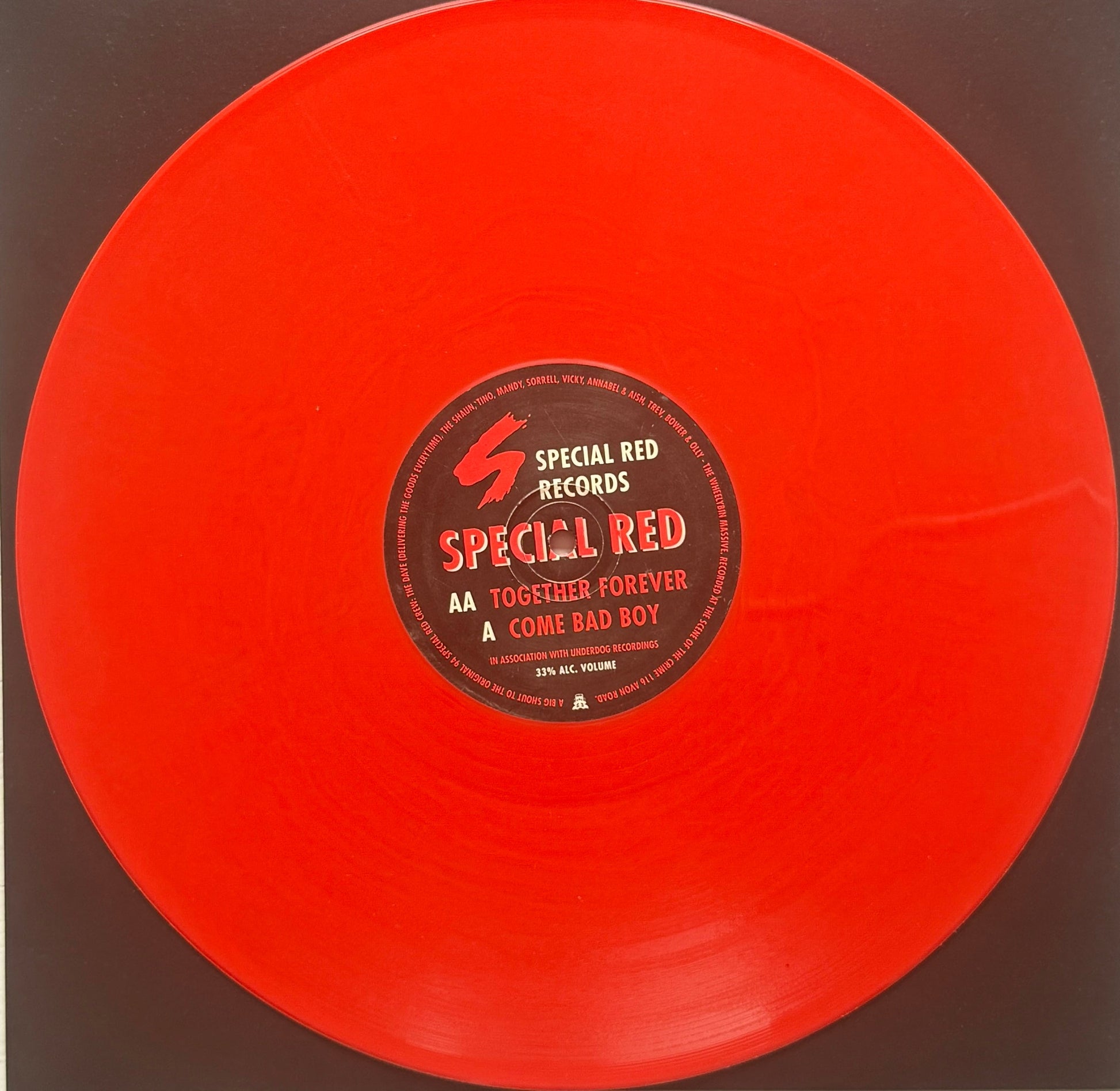 This rare 12" vinyl record by Special Red, released in 1994 under the record label Underdog Recordings, features the tracks "Come Bad Boy" and "Together Forever". The red coloured vinyl is in mint condition, making it a highly sought-after collector's item for fans of electronic music. With a catalogue number of UDR 006, this limited edition test pressing is a must-have for any vinyl enthusiast looking to add a unique piece to their collection.