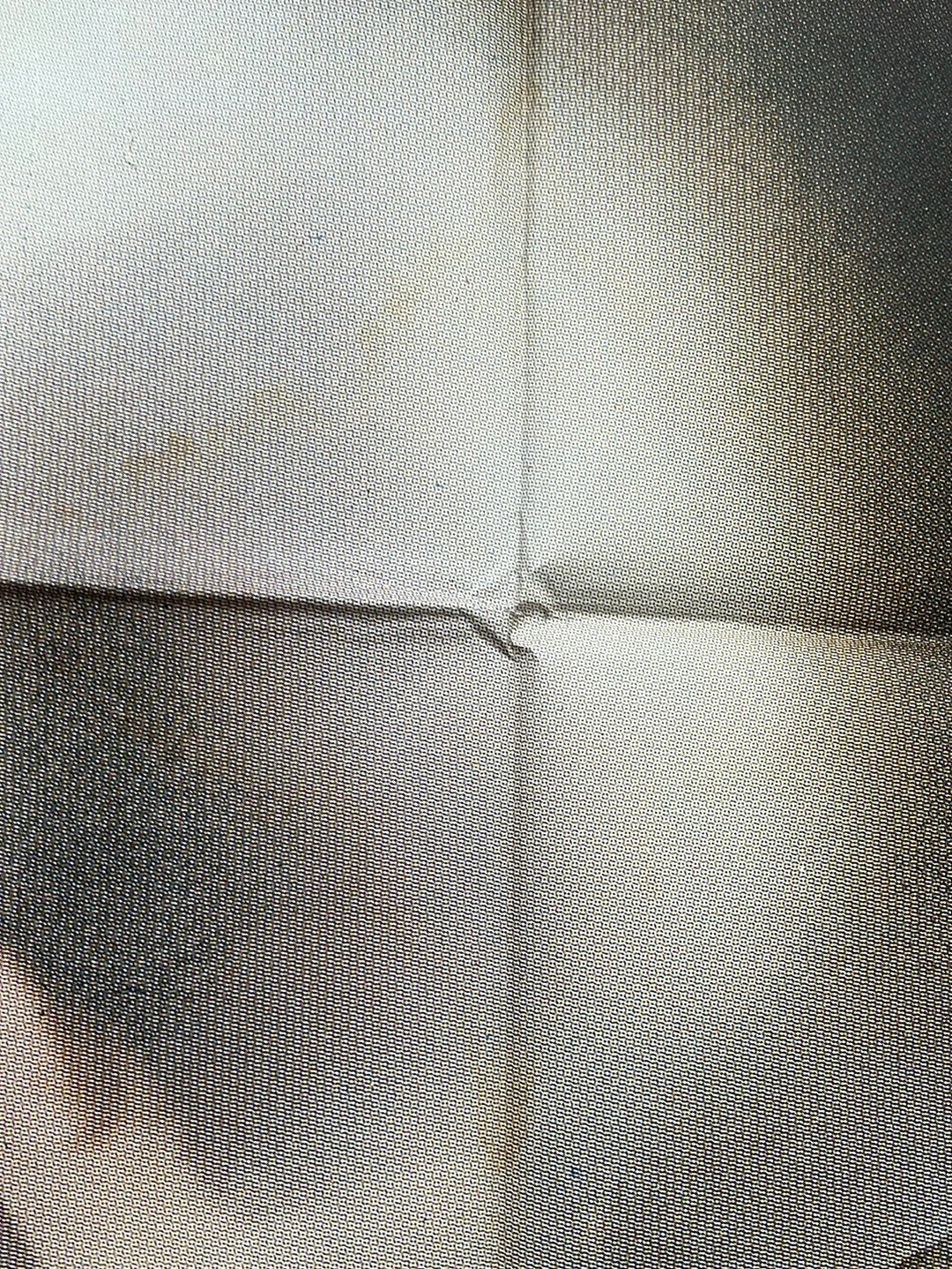 Liquid stain around top fold meet point. Edge and fold wear. Please see photos for condition.