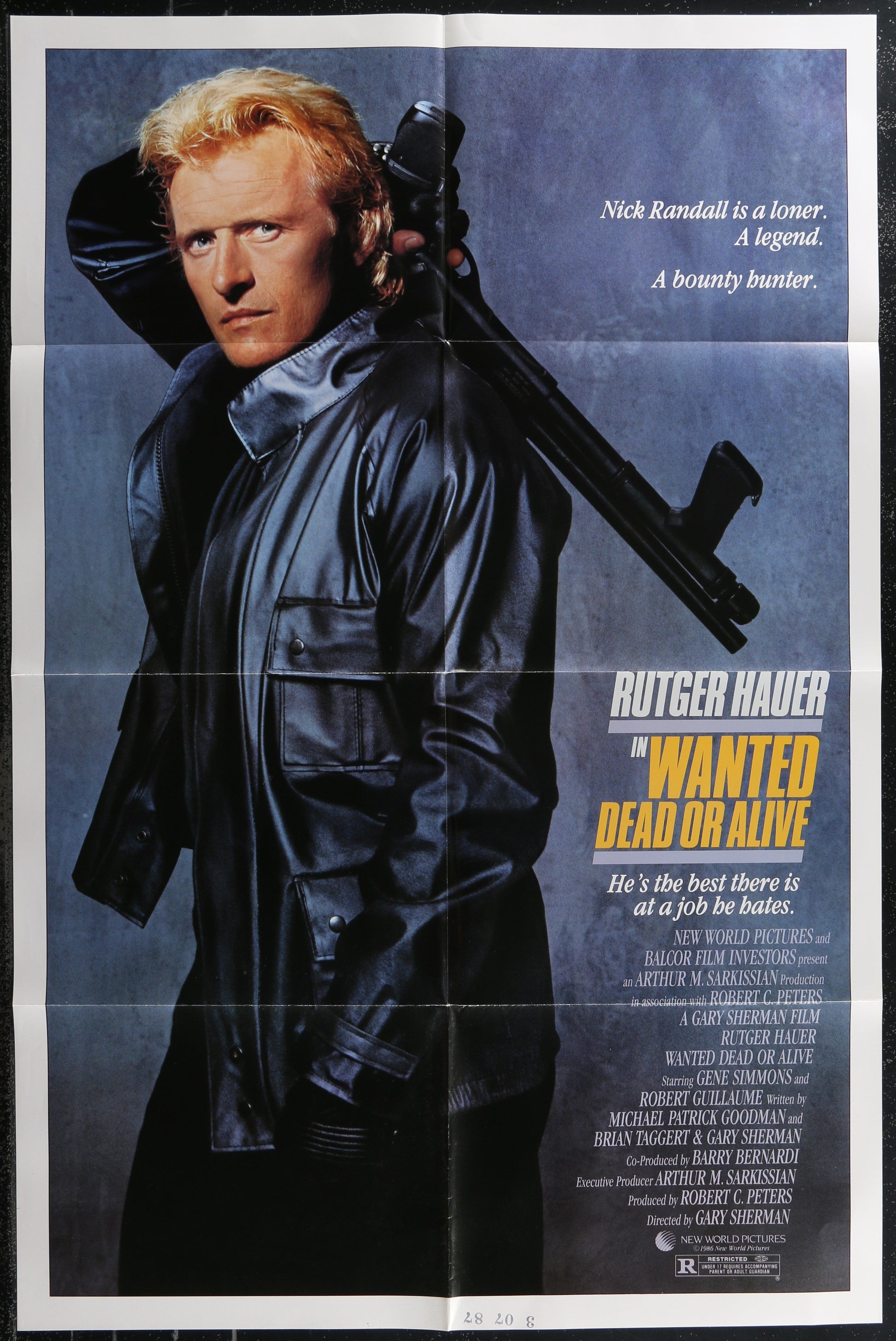 An original theatrical folded one-sheet movie poster (69 cm x 104 cm) for Wanted: Dead or Alive, the 1986 Gary Sherman action-thriller starring Rutger Hauer, Gene Simmons, and Robert Guillaume. Wear along edges and folds with small areas of separation at the fold meet points and an ink stamp in the border bottom centre.