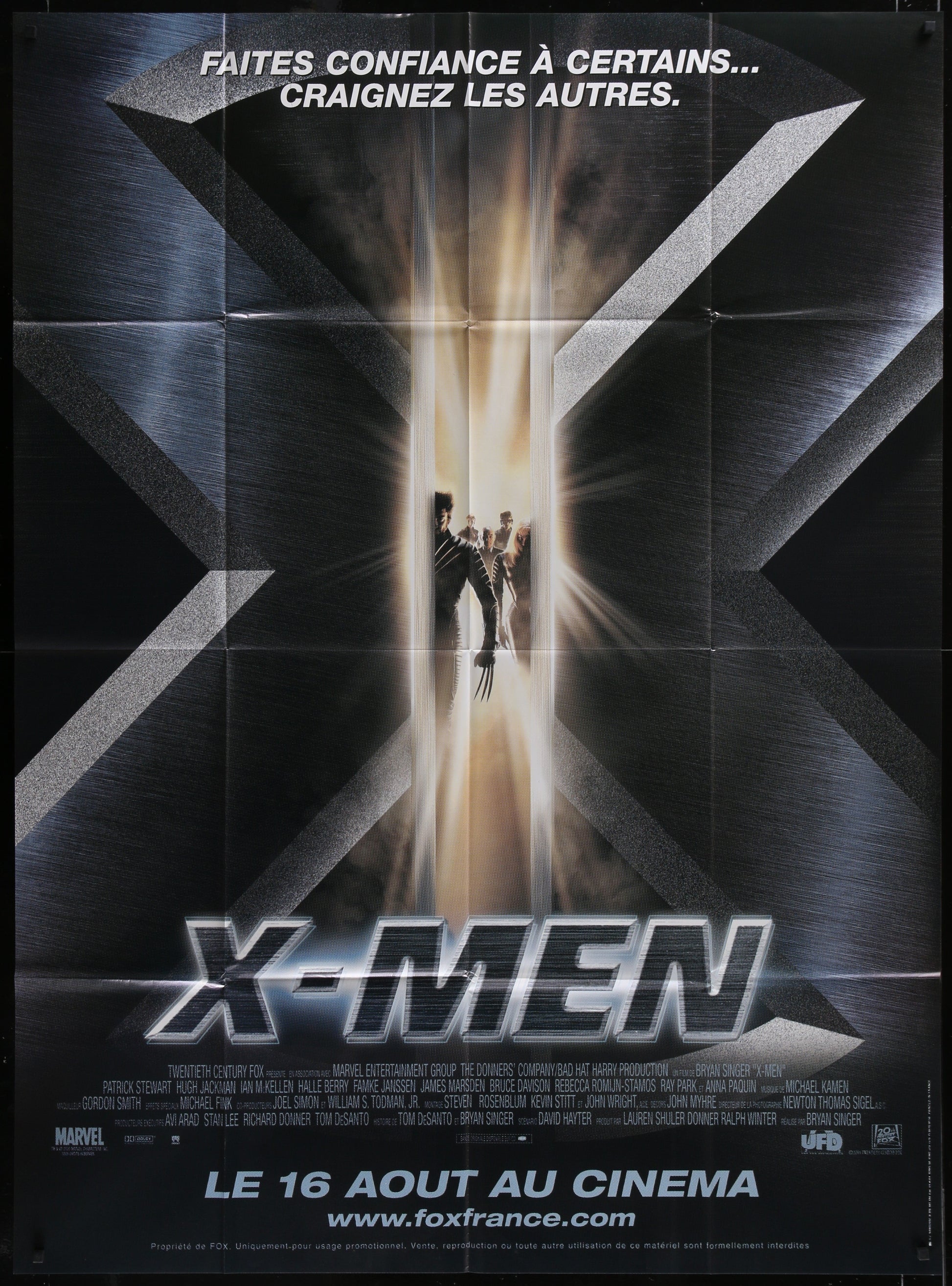 This X-Men (2000) Original French One Panel Movie Poster is a folded "Grande" size, measuring 45 1/2" x 62" (116 x 157 cm). It features stars Patrick Stewart, Hugh Jackman, Ian McKellen and Halle Berry in the Marvel comic book adventure directed by Bryan Singer. Edge and fold wear present.